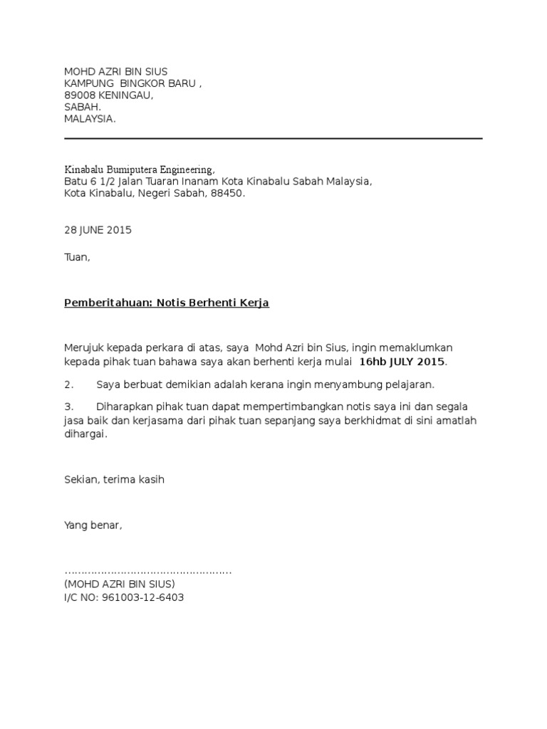 Contoh Surat Berhenti Kerja Notis Sebulan Pdf